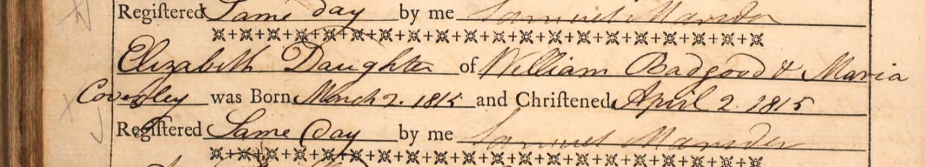 The following year on the 2nd March 1815, Maria gave birth to her first child, Elizabeth Coverley. Maria was not married however a fellow convict William Bidgood, who would call himself William Badgood, was identified as the father and a month later the two of them took baby Elizabeth to St John’s in Parramatta and have her dutifully baptised by the Reverend Samuel Marsden.