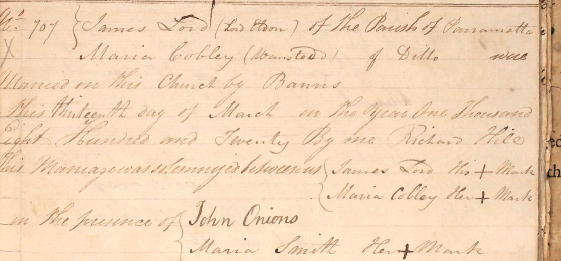 Life for Maria took a definite change on the 7th February 1820 the Colonial Secretaries papers records Maria as Cobley, being given permission to marry another convict, James Lord. James was brought to the colonies on the Lord Eldon. James had been convicted in England of larceny and sentenced to death which was then commuted to transportation. They had sought permission to marry which due to their convict status (even though Maria’s ended in 1819) was a pre-requisite. James was still serving his sentence when they married. As to the constantly differing changes in how Maria’s surname was spelled I doubt she was trying to be coy, rather as woman who could neither read nor write the spelling to her would have been irrelevant and it was probably just how she pronounced it. Note register of marriage is signed with her X along with her new husband’s X.