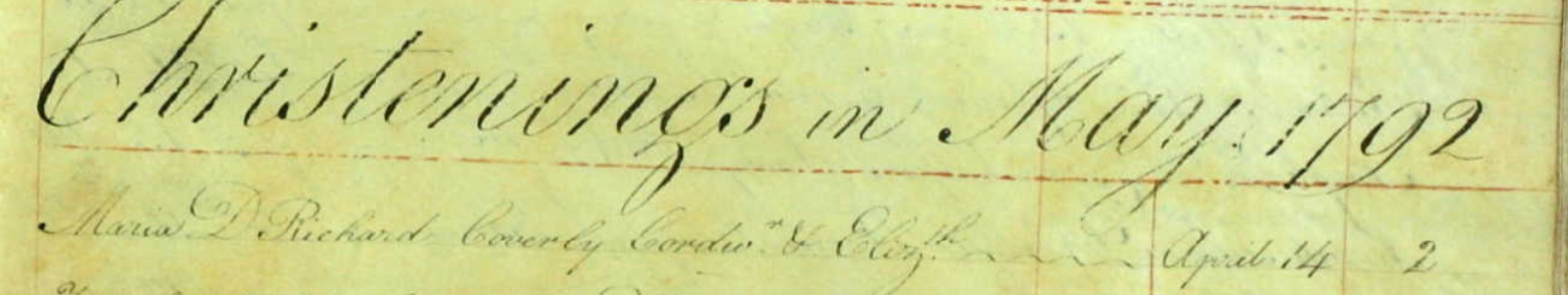 Maria Coverly was born on the 14th April 1792 and baptised on the 2nd May at St Giles Cripplegate, London, England. She was the daughter of Richard Coverly and his wife Elizabeth Burton. This was both of her parents second marriage and her parents had been married the previous August on the 15th, 1791.