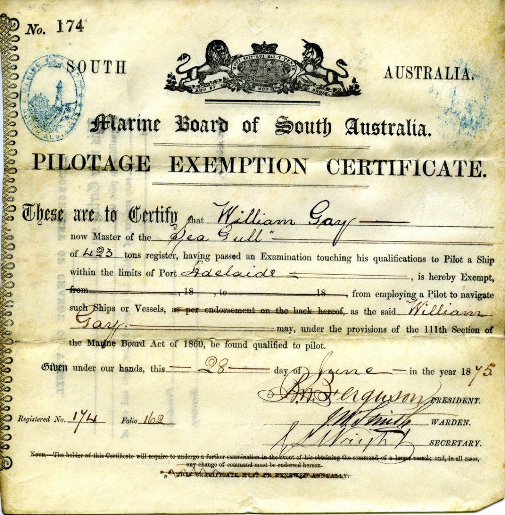 19th July William receives his Master Mariner certificate of Service in Adelaide, SA. Australia.