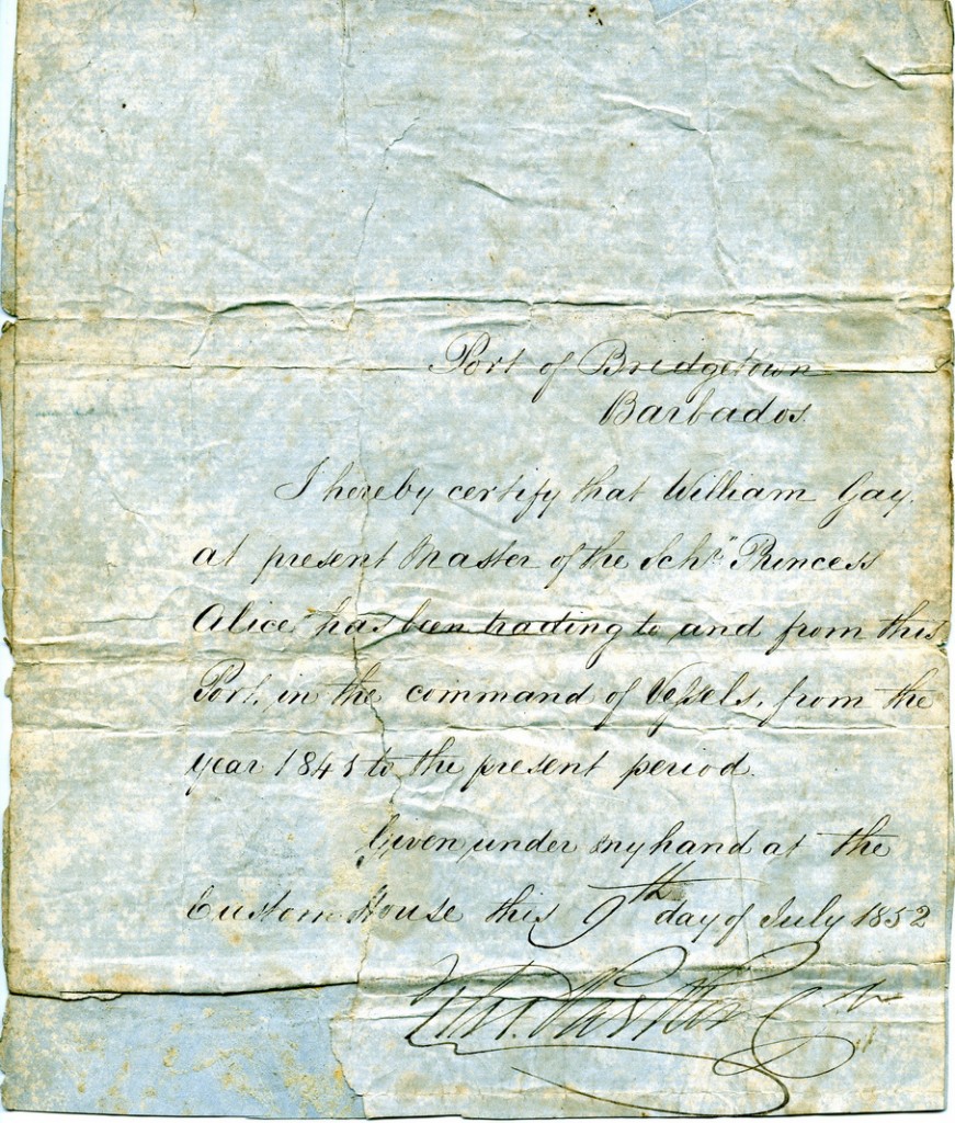 From 1845 to 1852 William was the Master of the Schooner, Princess Alice and trading to and from the Port of Bridgetown in Barbados.