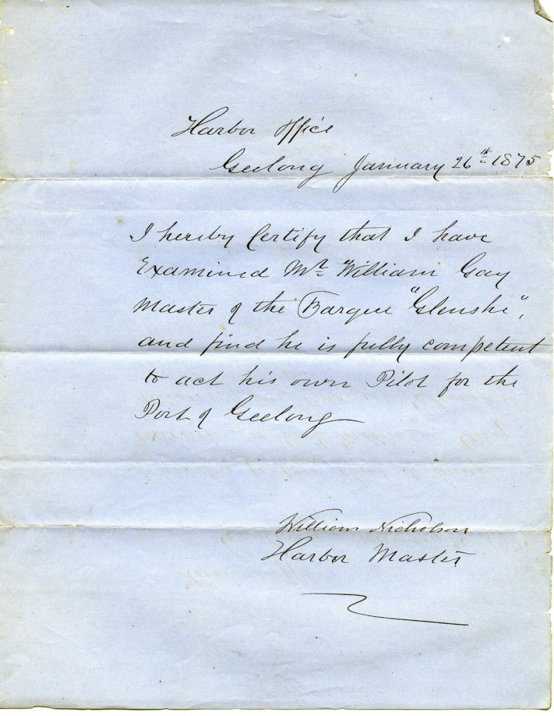 Certificate of Pilotage BarbadosWilliam and Eliza eventually made their way to Australia. William went on to have certainly an interesting maritime career. Following are several newspaper reports I have been able to locate. They start off so positively with the dashing Captain Gay saving other’s at sea. Unfortunately they don’t always stay that way.