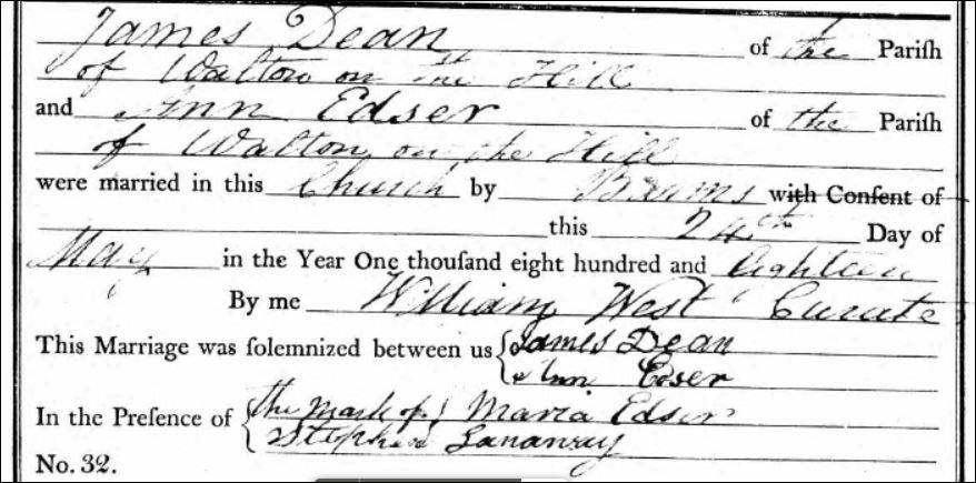 James Dean of Walton on the Hill (parish) and Ann Edser of the parish of Walton on the HIll were married in this church by banns this 24th day of May 1818 by me William West curate. Headley, St Mary the Virgin (register 1813-1836). Both signed their name in the register. They were married with Maria Edser as a witness who left her ‘mark’. Surrey England, Church of England Marriages and Banns 1754-1937.