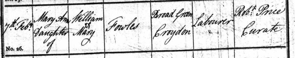 Mary Ann Fowles was baptised 7 Feb 1813 daughter of William and Mary Fowles of Broad Green, Croydon. Father William occupation, Labourer.