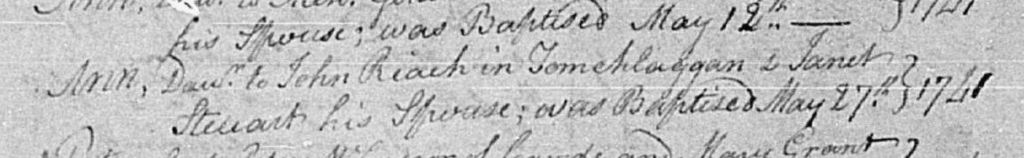 Anne Riach was born on the 27th May 1741 to John Riach (b.1711) and Janet Stewart (b?). At Tomachlaggan. Banffshire.