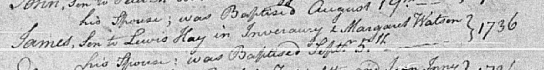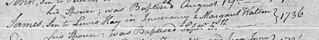 James Hay was baptised on the 5th September 1736 in the village of Tomintoul, parish of Kirkmichael. It is located in the county of Banffshire (also known as Banff). James was the son of Lewis Hay (@1710) and Margaret Watson (@1710). His parents were both from the county of Banffshire.