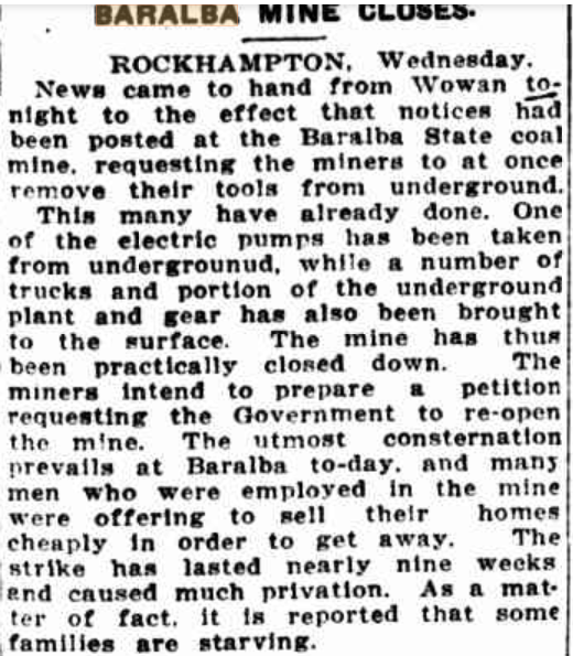 The years leading up to 1930 featured frequent strikes and stoppages at the mines where workers frustrated by dangerous and hard conditions wanted their circumstances improved. At several points the Minister for Mines himself closed the mines to force the workers back with no changes to their situation. The Minister for Mines in Queensland (Mr Jones), consistently took a hard stance on this blaming workers for wanting to cause trouble by unionising. In 1921 during one such closure Mr Jones made a public statement to the newspapers that ‘the mine would remain closed until it was clearly and definitively accepted that he as the representative of the Government and not employees, was in control, and that direct actions would not be tolerated’. (Toowoomba Chronicle 29/9/21)