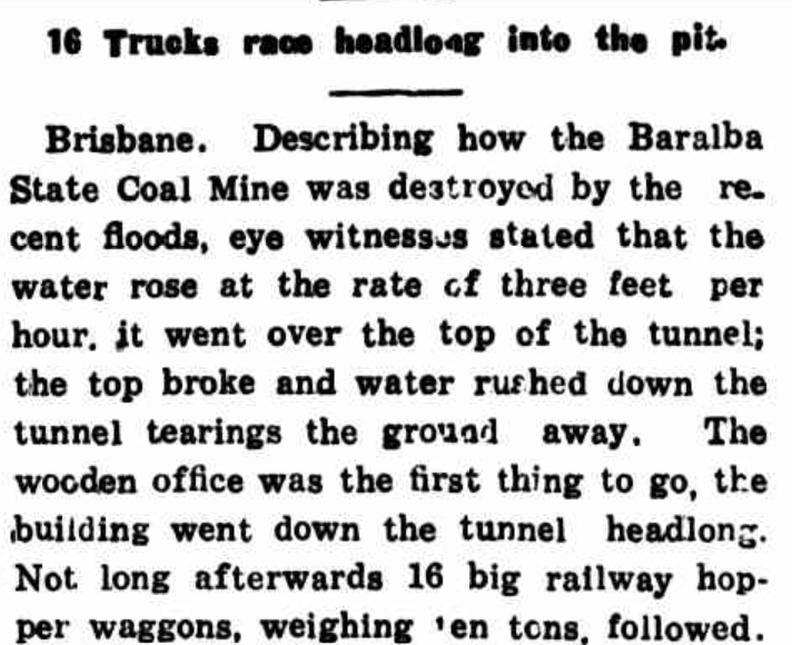 RECORD FLOOD AT BARALABA, STATE MINE COLLAPSES. Rockhampton, Friday —A message from the Stationmaster at Baralaba stated the town experienced the greatest flood on record. The highest point was reached on Monday when the State Coal Mine collapsed, carrying away 29 of the largest hopper waggons and the main office. The whole completely disappeared from view. 28th May Bowen Independent, QueenslandT
