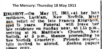 Eleven years later in 1911 the Hobart Mercury reported the death of Mary Ann.