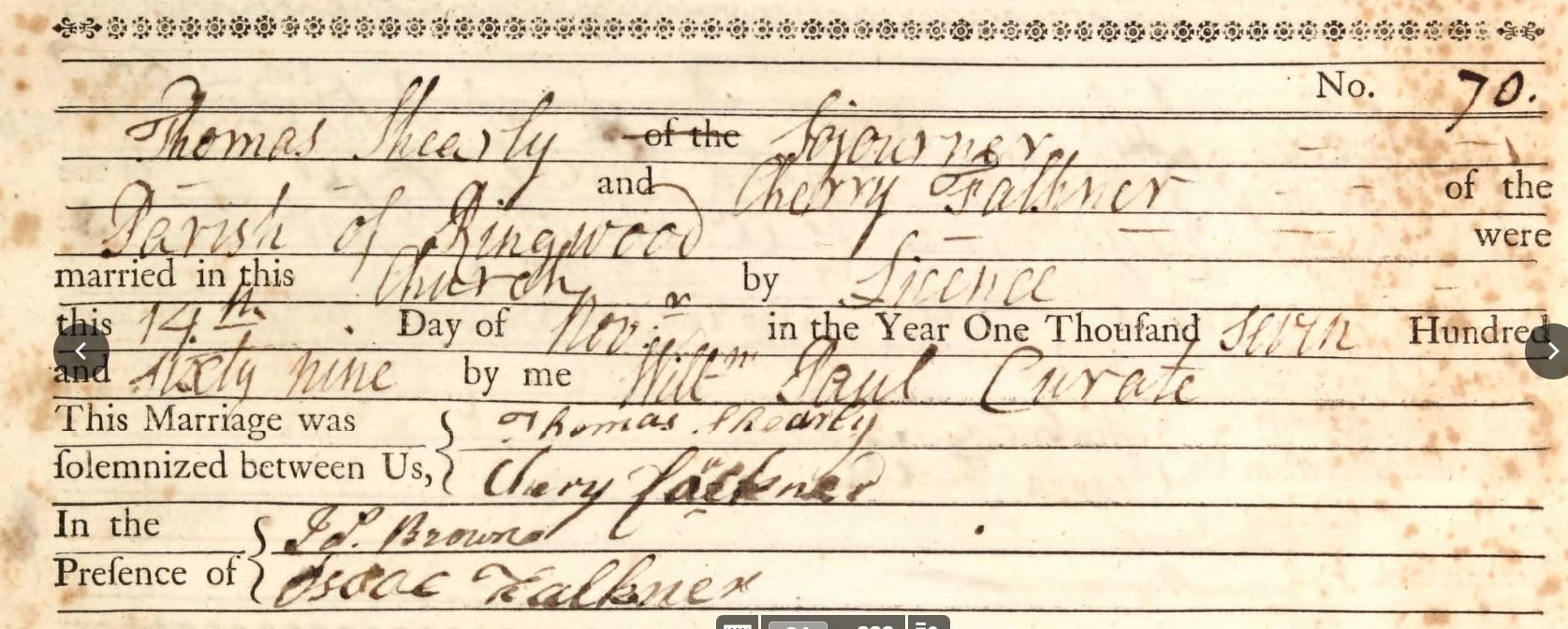 Thomas and Cherry/Charity Shearly, Sherly, Sharley of Richmond, Hampshire England married in Richmond on the 14th of November 1769. Thomas gave his occupation as a Sojourner. A Sojourner being a traveling person, a temporary resident.